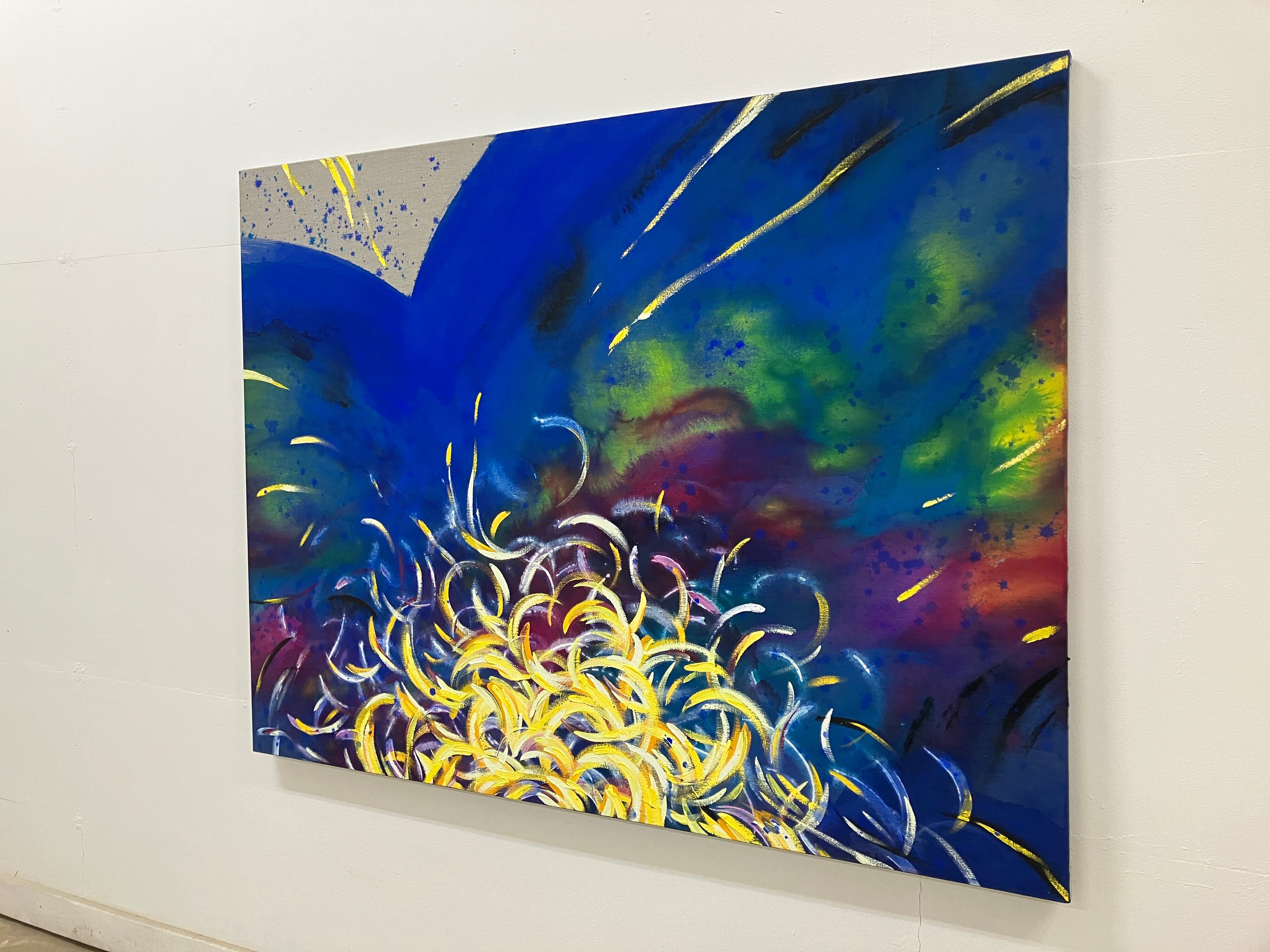 魂の存在というものがあるとすれば、エネルギーがぐるぐる回り響き合う、その動きそのものではないか。その響きを、魂の歌声を描いたシリーズです。「円」や「円の一部としての曲線」は、巡り回って循環していく形。下地を塗らない亜麻をキャンバスに用い、布地そのものの面は現実空間を表し、滲んだ背景や広がりをもつ色面は、空でも宇宙でもこの世でもない、無形のエネルギーの広がりを表しています。その境界の中で色とりどりに輝く、魂の響きが躍動します。