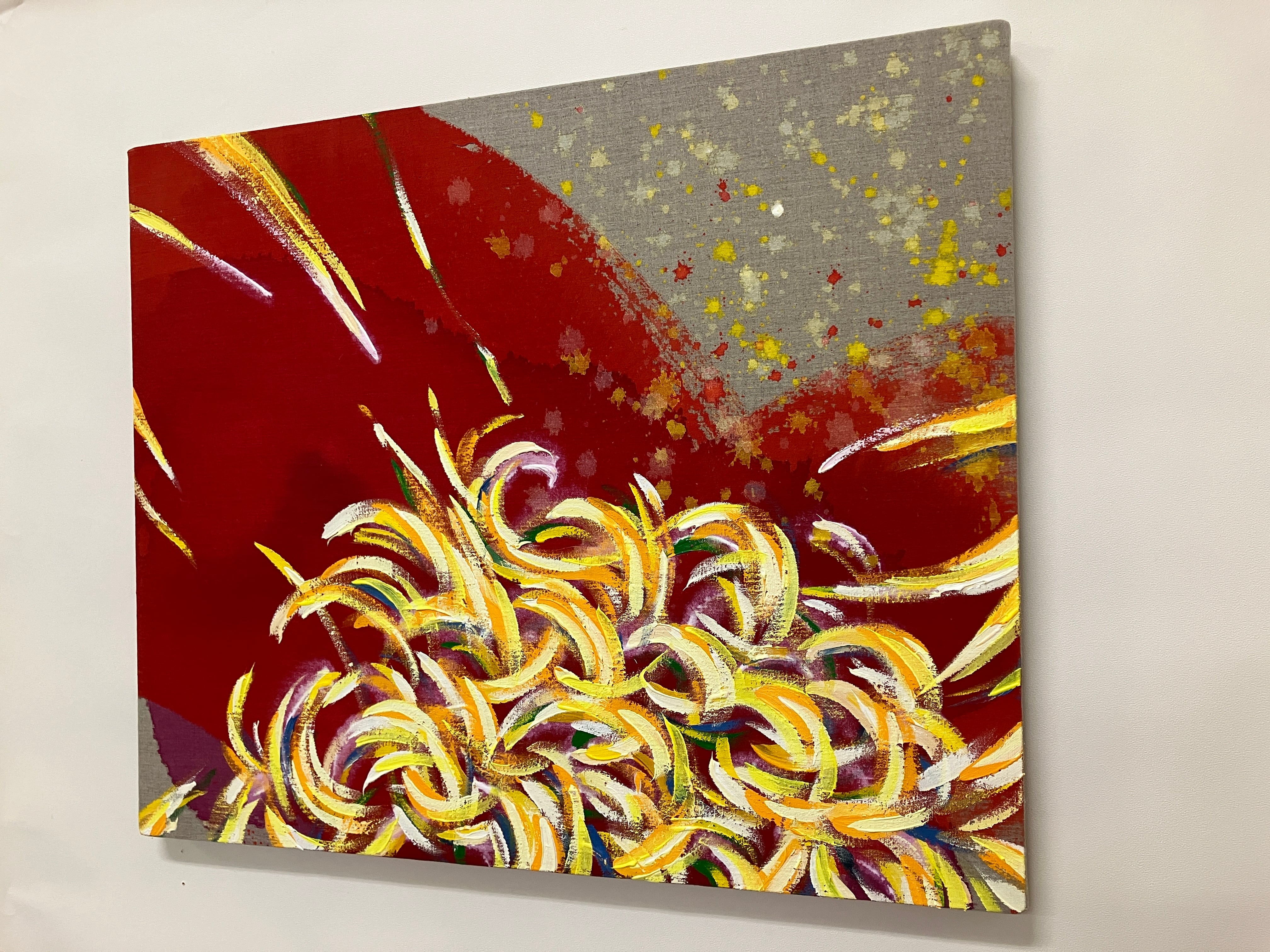 魂の存在というものがあるとすれば、エネルギーがぐるぐる回り響き合う、その動きそのものではないか。その響きを、魂の歌声を描いたシリーズです。「円」や「円の一部としての曲線」は、巡り回って循環していく形。下地を塗らない亜麻をキャンバスに用い、布地そのものの面は現実空間を表し、滲んだ背景や広がりをもつ色面は、空でも宇宙でもこの世でもない、無形のエネルギーの広がりを表しています。その境界の中で色とりどりに輝く、魂の響きが躍動します。