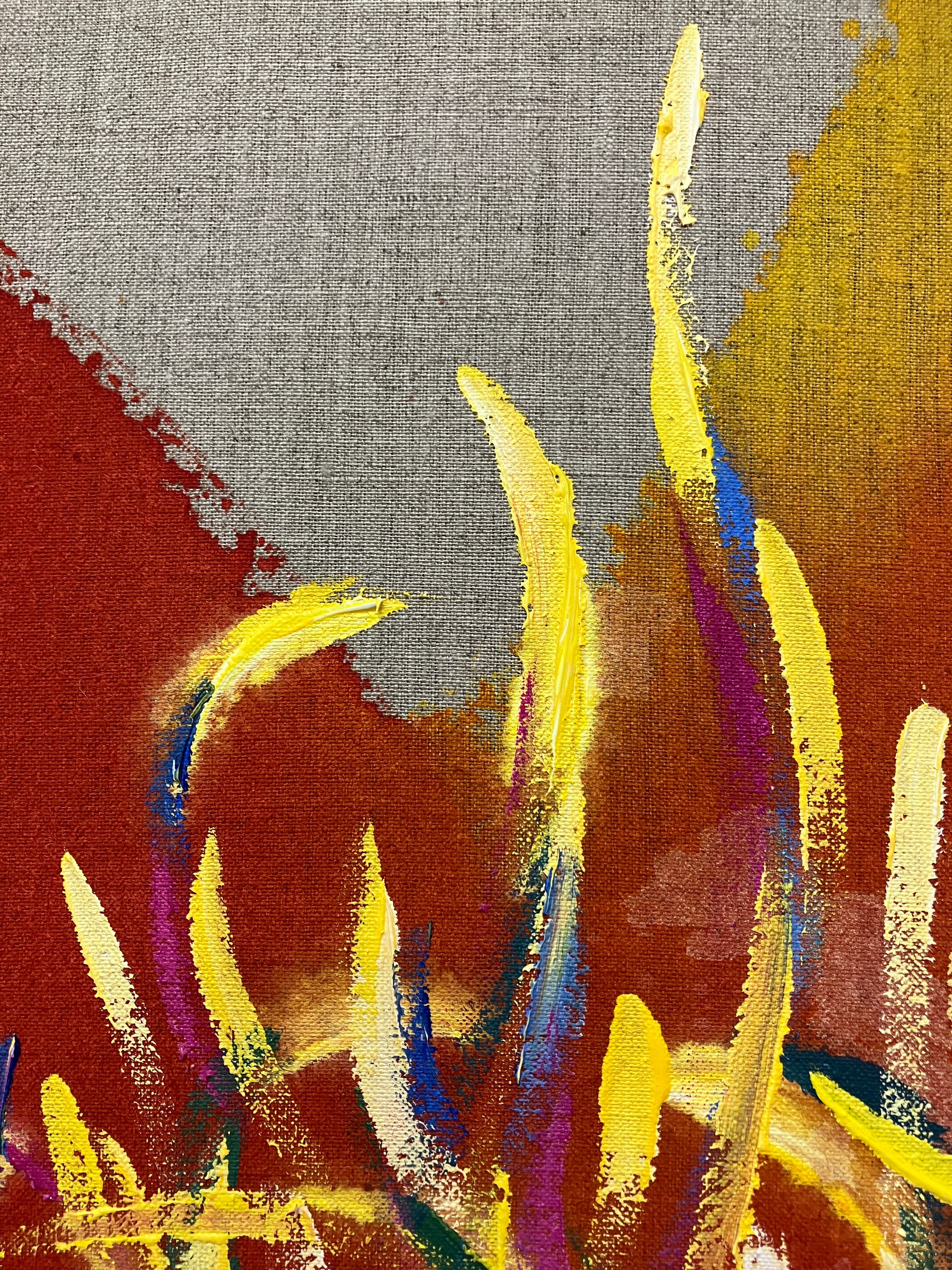 魂の存在というものがあるとすれば、エネルギーがぐるぐる回り響き合う、その動きそのものではないか。その響きを、魂の歌声を描いたシリーズです。「円」や「円の一部としての曲線」は、巡り回って循環していく形。下地を塗らない亜麻をキャンバスに用い、布地そのものの面は現実空間を表し、滲んだ背景や広がりをもつ色面は、空でも宇宙でもこの世でもない、無形のエネルギーの広がりを表しています。その境界の中で色とりどりに輝く、魂の響きが躍動します。