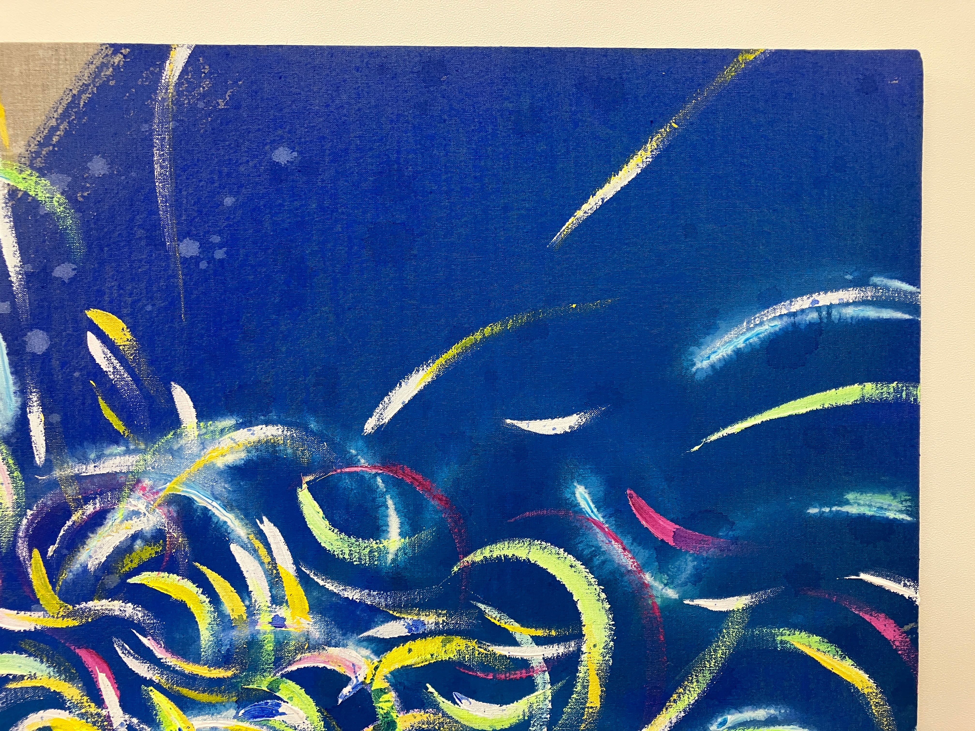 魂の存在というものがあるとすれば、エネルギーがぐるぐる回り響き合う、その動きそのものではないか。その響きを、魂の歌声を描いたシリーズです。「円」や「円の一部としての曲線」は、巡り回って循環していく形。下地を塗らない亜麻をキャンバスに用い、布地そのものの面は現実空間を表し、滲んだ背景や広がりをもつ色面は、空でも宇宙でもこの世でもない、無形のエネルギーの広がりを表しています。その境界の中で色とりどりに輝く、魂の響きが躍動します。