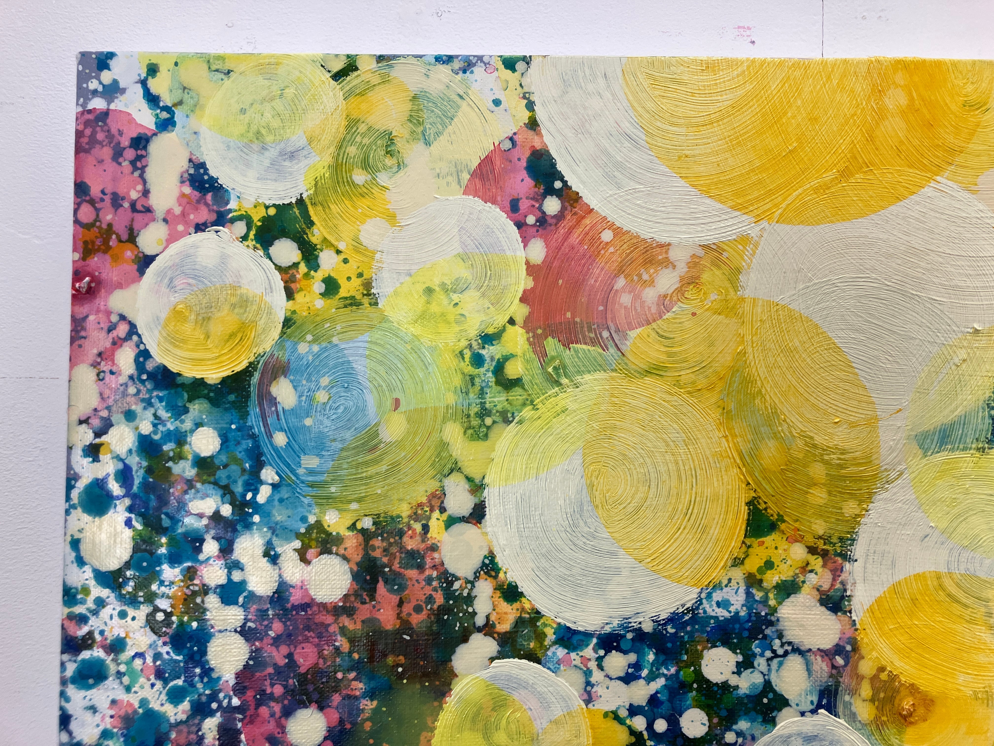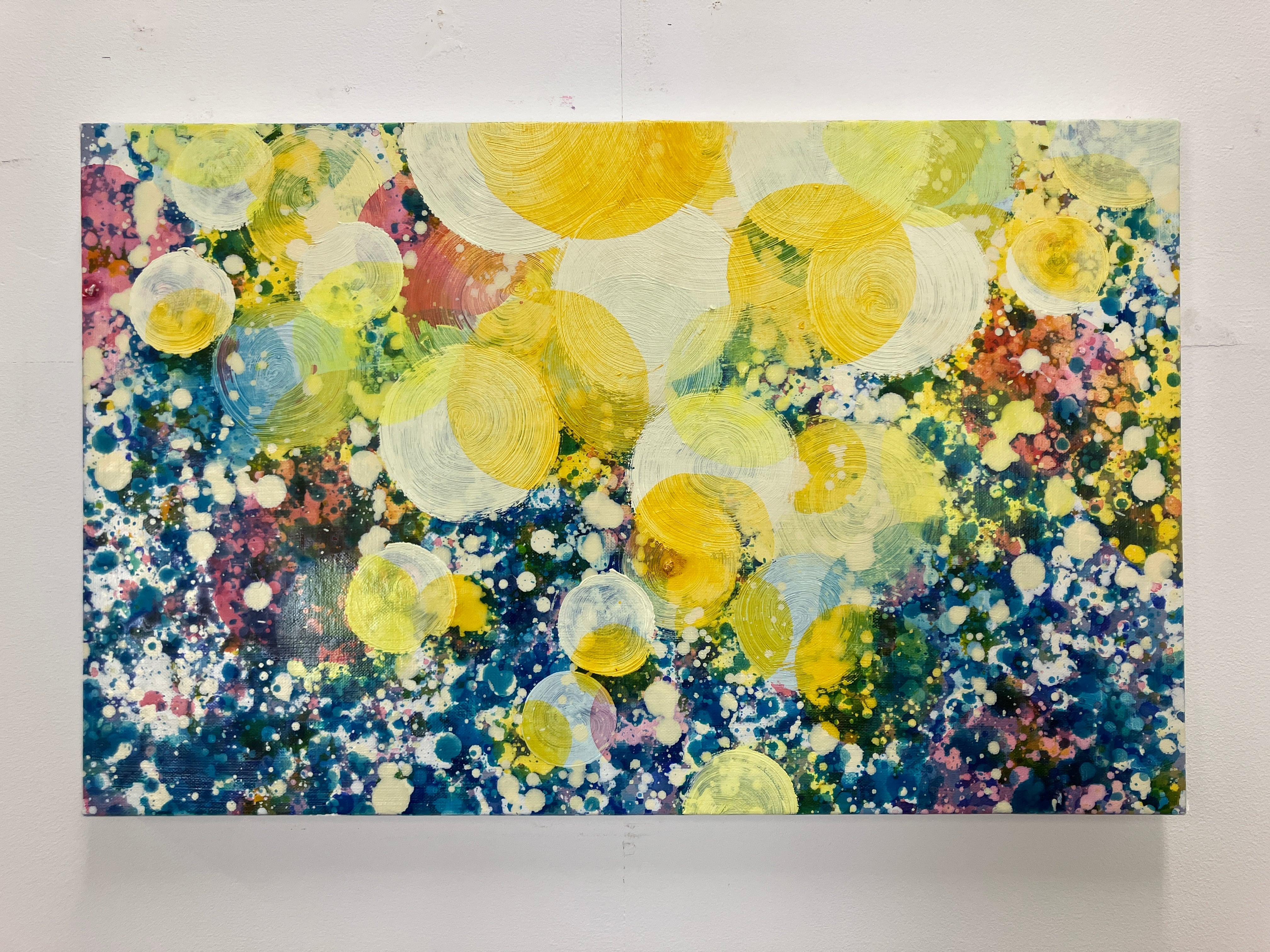 地球に降り注ぐ、無形のエネルギーを表現したシリーズです。透明感のある美しい色彩の重なりは、オーロラのような輝きや花火のようなきらめきとも評され、壮大なスケール感と繊細で神秘的なムードを併せ持っています。独特の透明感と浮遊感は、ポタポタと薄い絵の具をたらすことを繰り返すことにより生み出されます。4m近くの大きな作品から、手のひらにのるサイズの作品まで、光り輝く色彩の渦が、見る人に明るく力強いエネルギーを届ける作品群です。