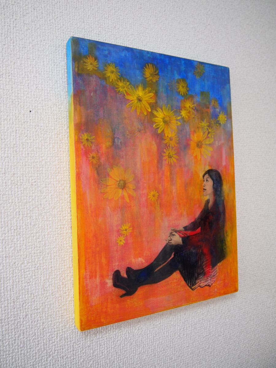 テンペラ画による黄色い花の前に女性がたたずんでいる絵です。