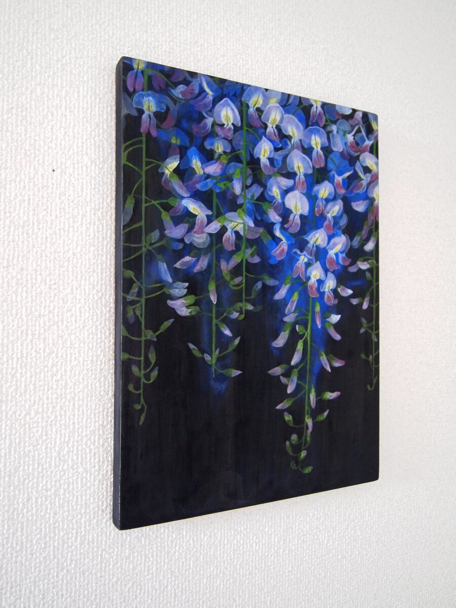 暗い背景に浮かび上がるような藤が美しい作品です。