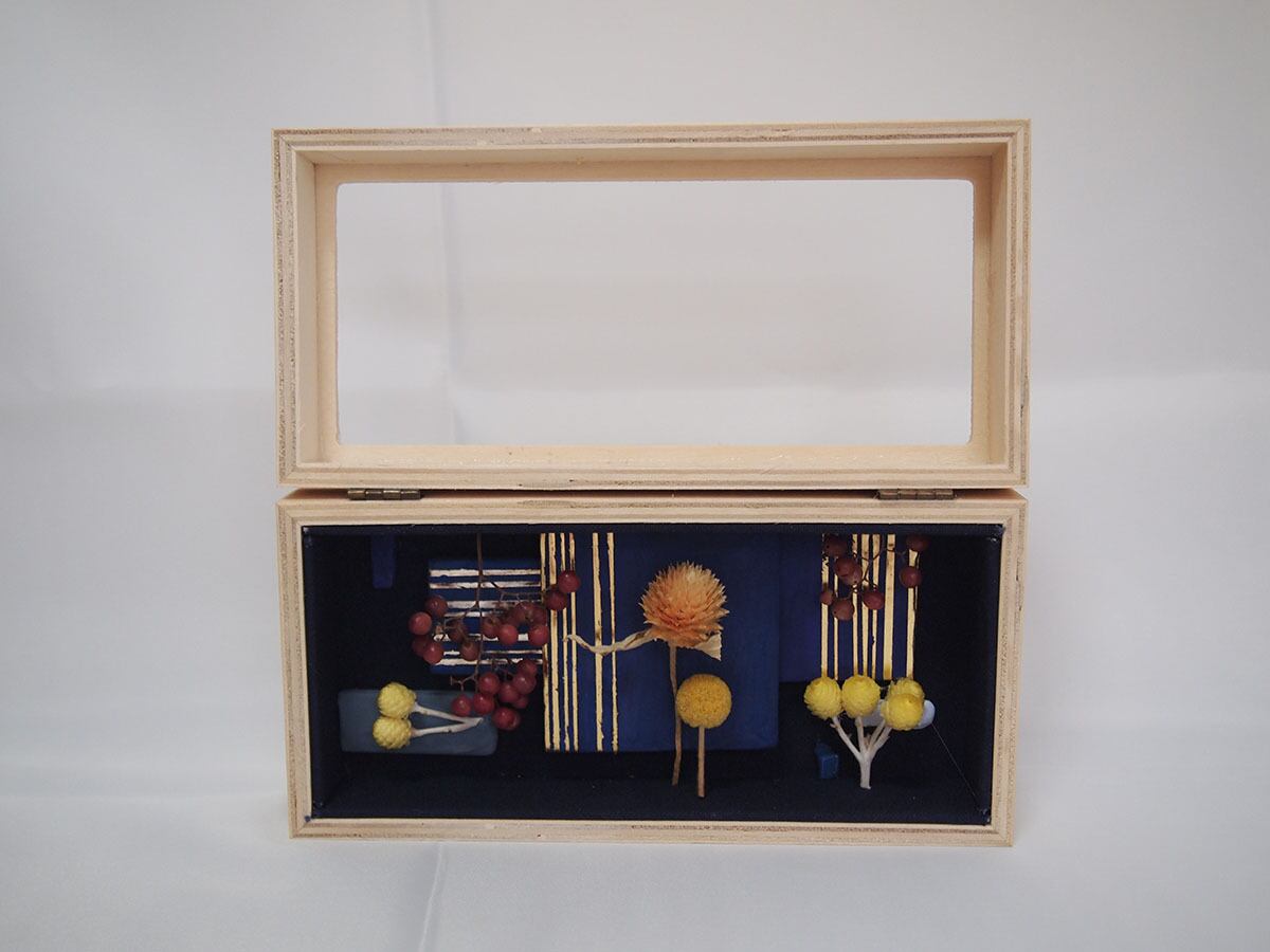 素材:ディスプレイボックス、段ボール、布、板、石膏、顔料、水干絵具、卵、うるし、金箔、銀箔、ドライフラワー
