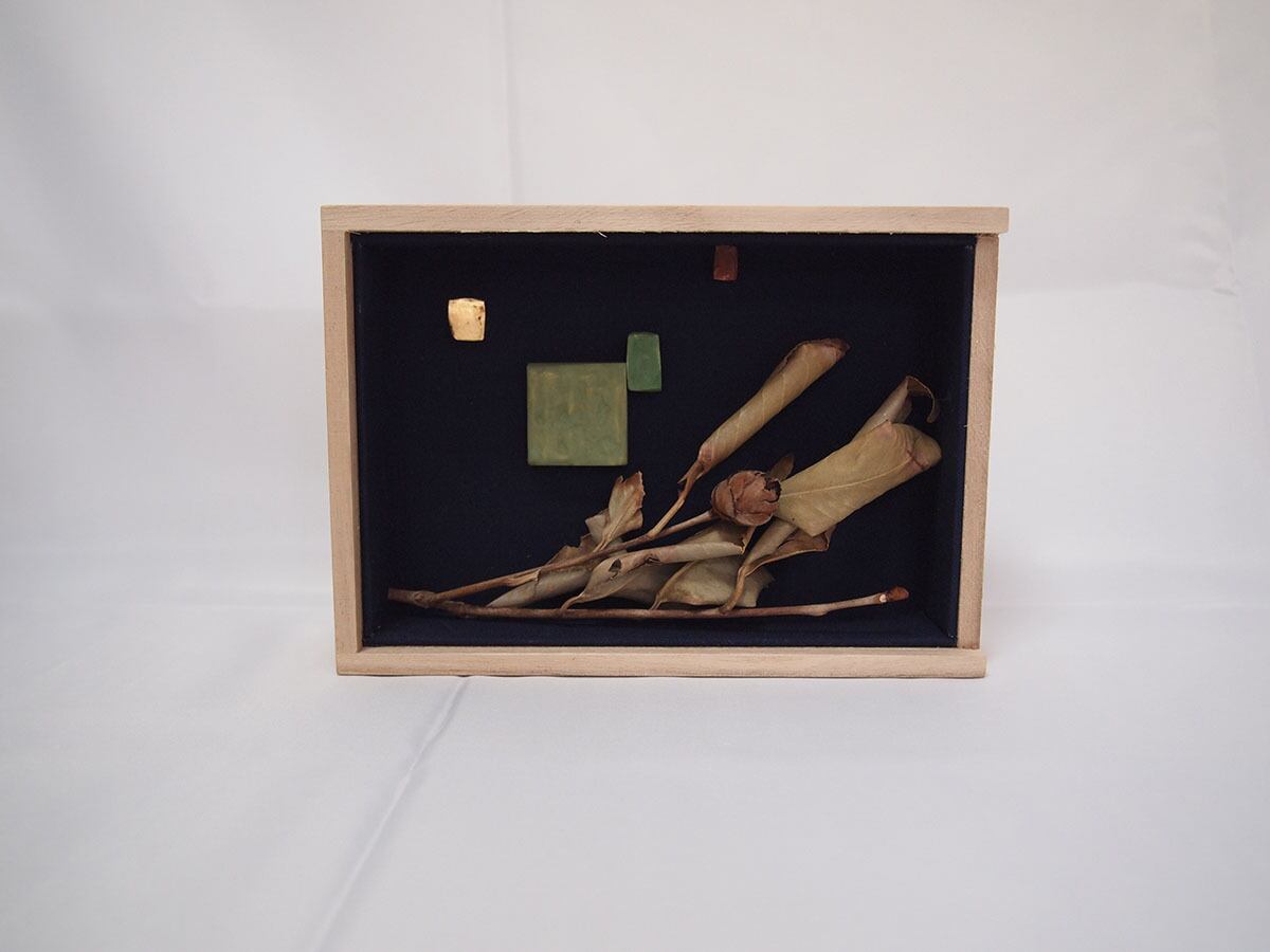 「リズム」シリーズは、 複数の異なった素材を 組み合わせ作った作品です。このシリーズでは、テンペラ画に使用される石膏やテンペラ絵具などの素材そのものの美しさを引き出そうと試みています。箱の中に、色を塗った石膏とドライフラワーを組み合わせ、有機的な美を表現しました。形と色彩によるリズムを作り出すことにより、自然との調和を表現しようとしています。