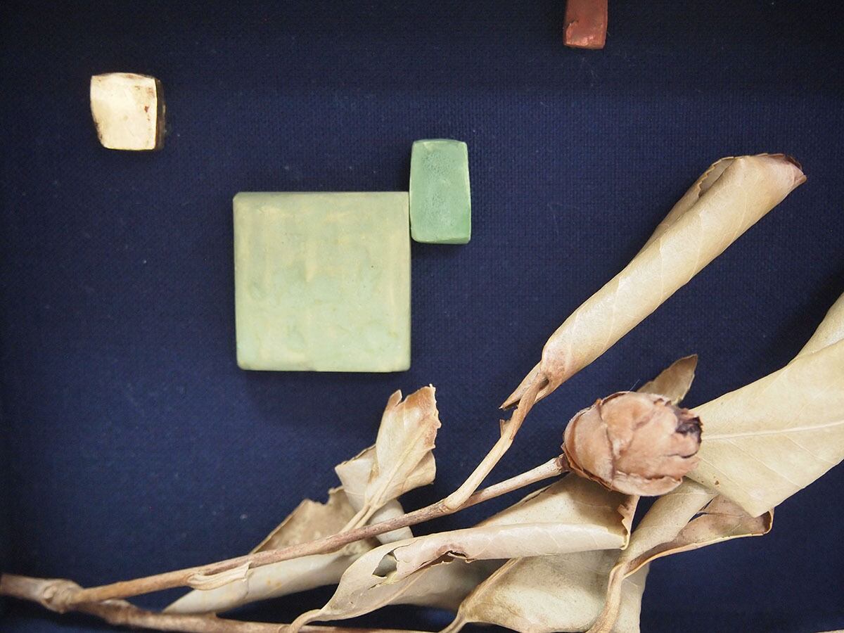 素材:ディスプレイボックス、段ボール、布、板、石膏、顔料、水干絵具、膠、ボーロ、金箔、椿の枝