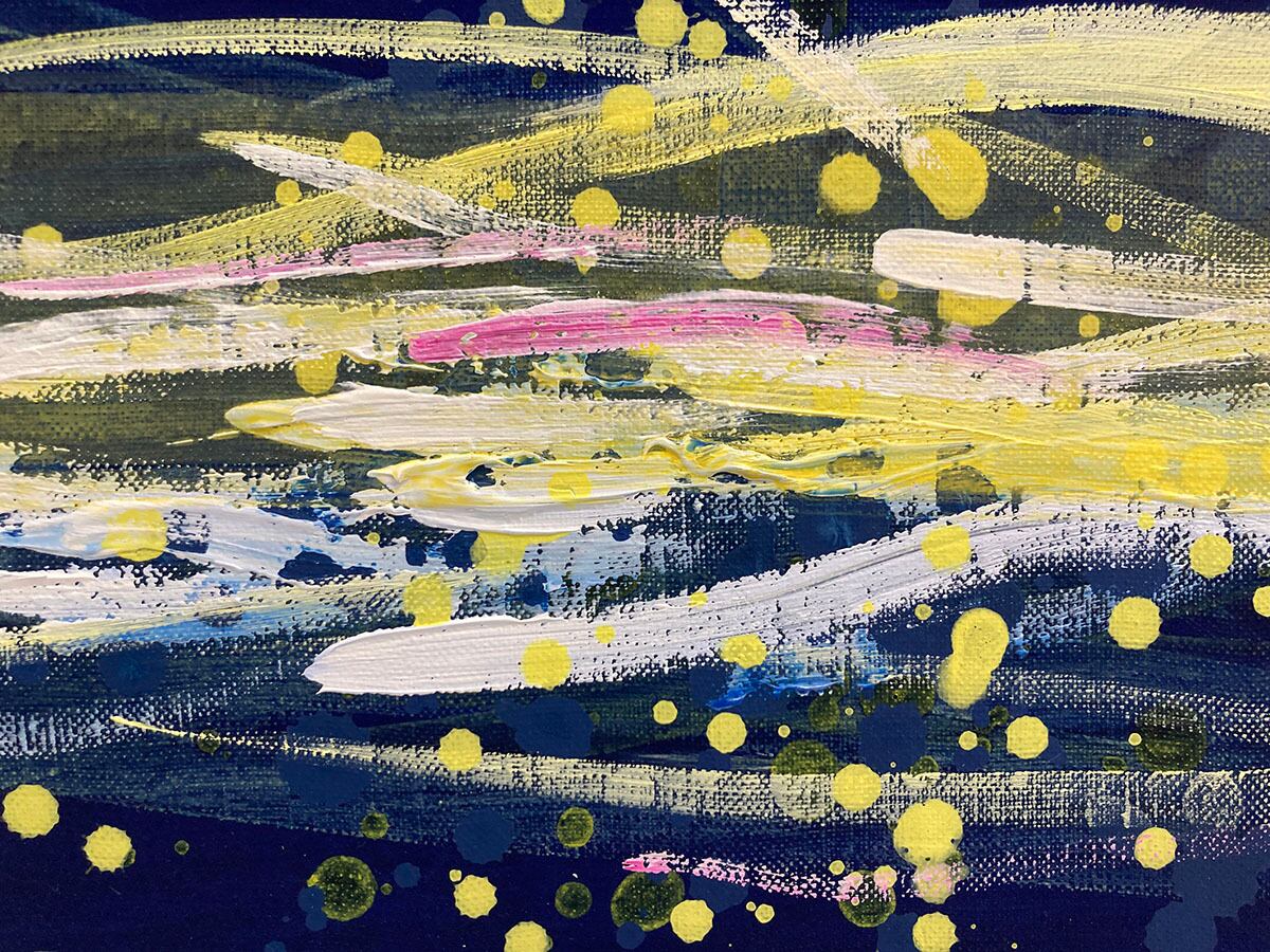 「ひかりのほうへ」シリーズでは、人間の感情に着目し、そのようなエネルギーをいかにして具体化できるか探求しています。富山優子さんの楽曲に感銘を受け、私の個人的な人間関係の感情的な見つめ直したことをきっかけに、色を通してこのような心のゆらぎ・エネルギーを表す必要があると感じ、油彩の抽象画シリーズの制作が始まりました。愛情や嘆きなどの人間の感情や光の存在など、具象では表しきれない無形のエネルギーを色彩によって表現することを目指しています。