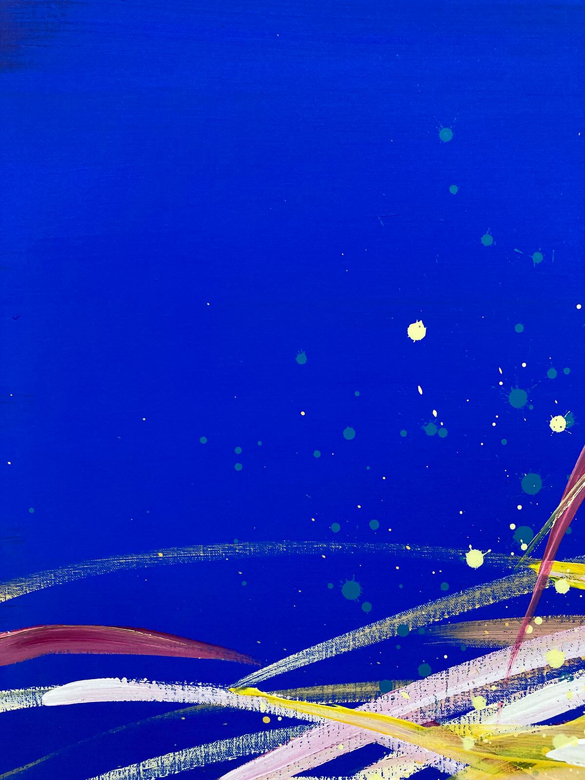 この作品は、背景の鮮やかな青で、空でも宇宙でもこの世でもない無形のエネルギーの広がりを表現し、そこに光り輝く魂の旅路をあらわしました。