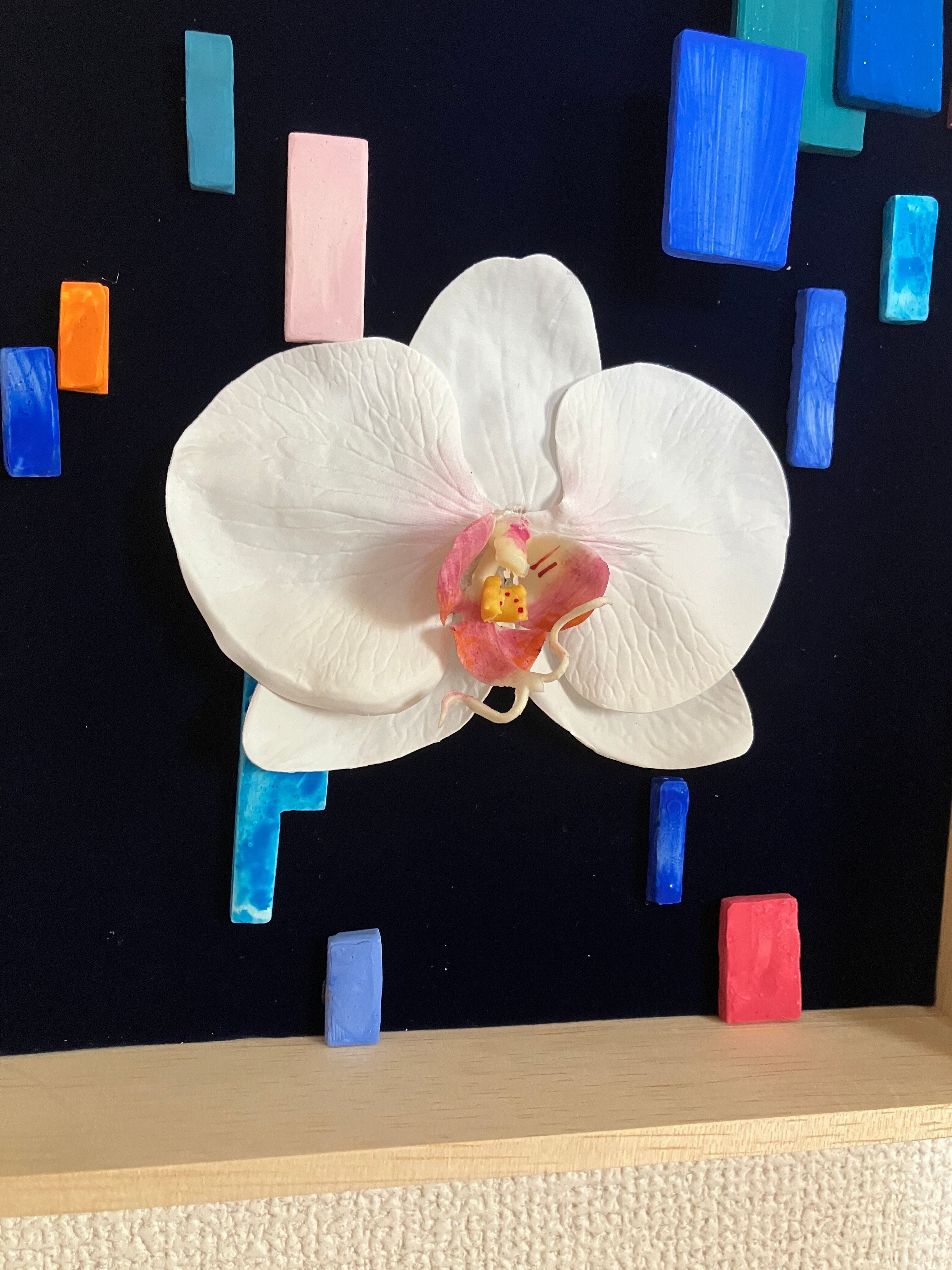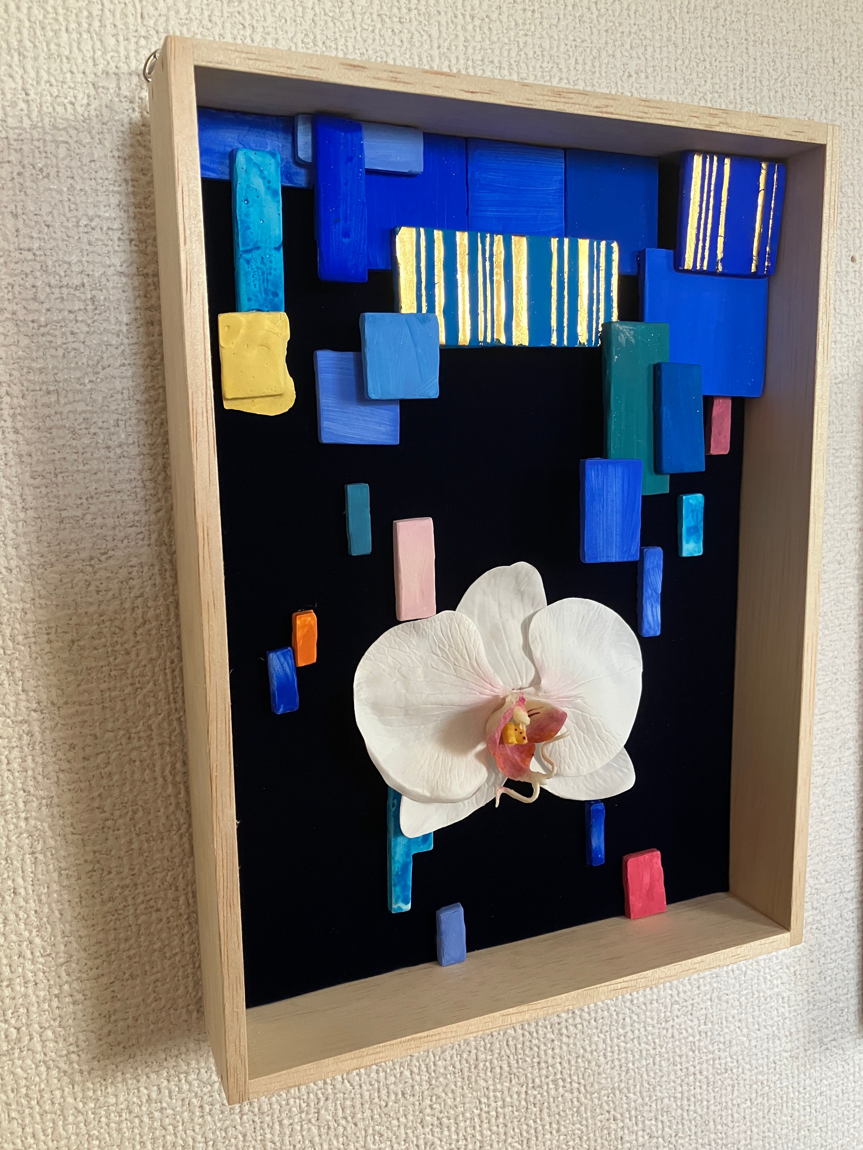 「リズム」シリーズは、複数の異なった素材を組み合わせ作った作品です。テンペラ画に使用される石膏やテンペラ絵具などの素材そのものの美しさを引き出そうと試みています。箱の中に、色を塗った石膏とアーティフィシャルフラワーを組み合わせ、有機的な美を表現しました。形と色彩によるリズムを作り出すことにより、自然との調和を表現しようとしています。