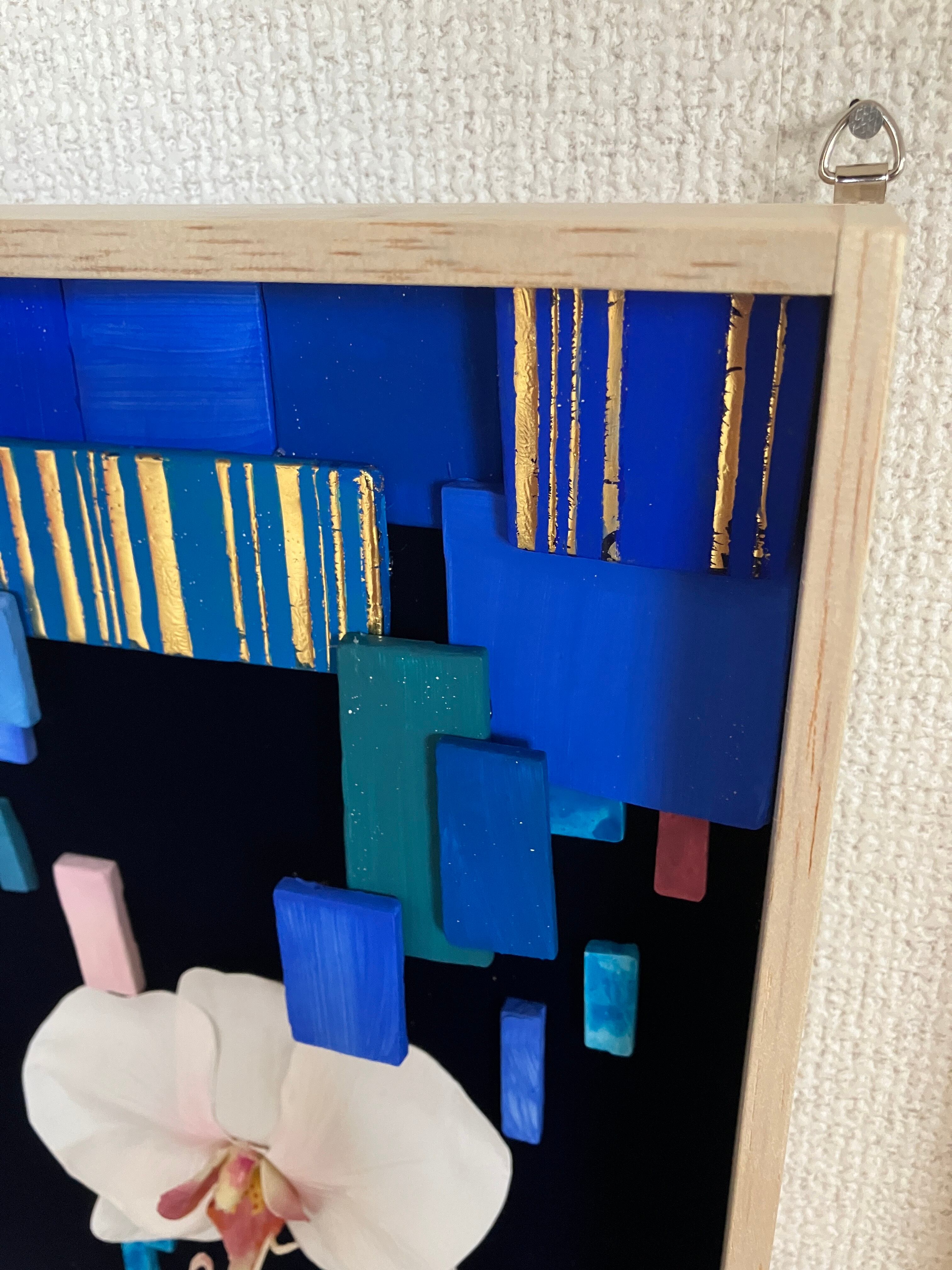 素材:桐箱、板に石膏地、アクリルガッシュ、うるし、金箔、アーティフィシャルフラワー、厚紙、布