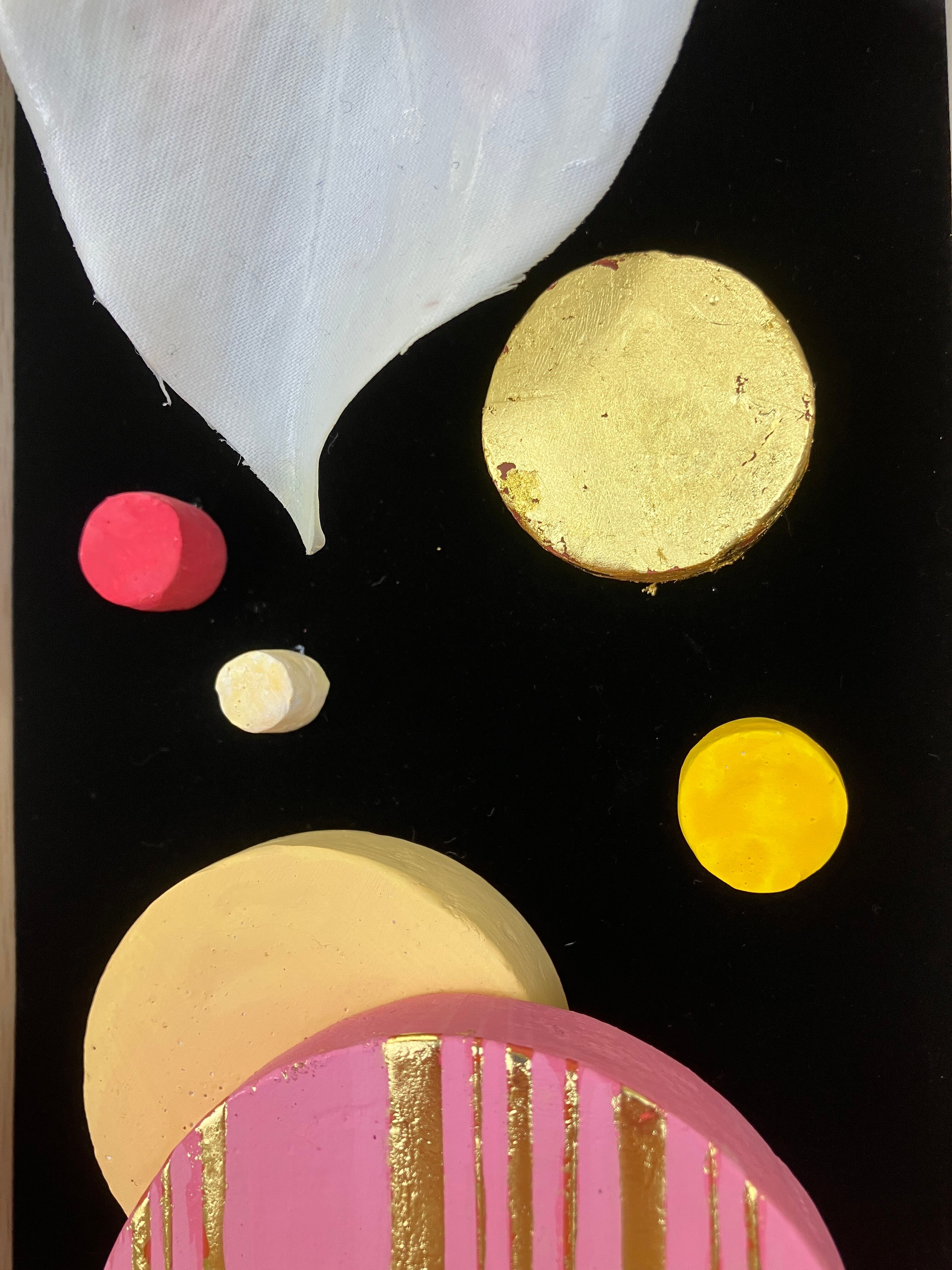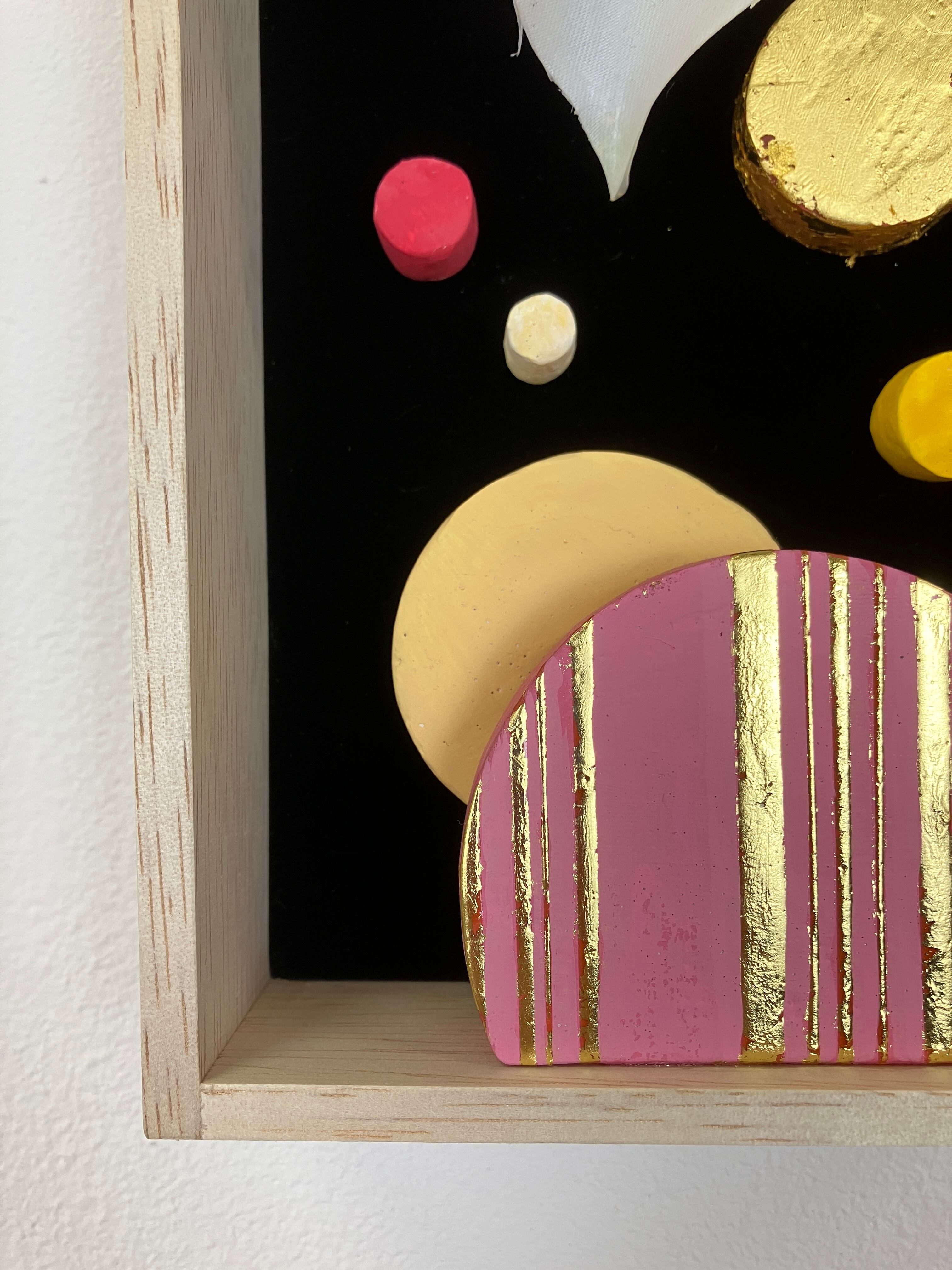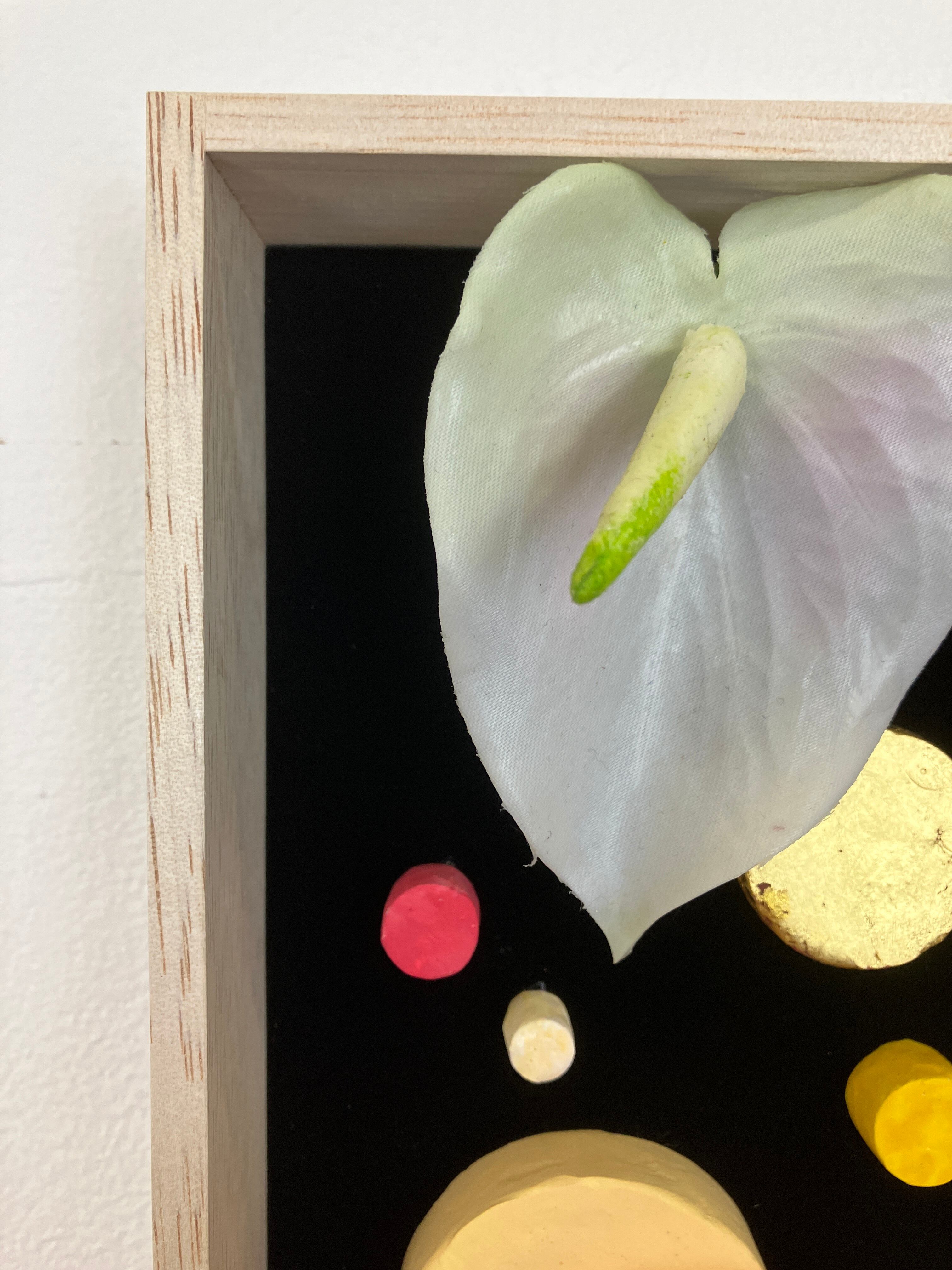 「リズム」シリーズは、複数の異なった素材を組み合わせ作った作品です。テンペラ画に使用される石膏やテンペラ絵具などの素材そのものの美しさを引き出そうと試みています。箱の中に、色を塗った石膏とアーティフィシャルフラワーを組み合わせ、有機的な美を表現しました。形と色彩によるリズムを作り出すことにより、自然との調和を表現しようとしています。